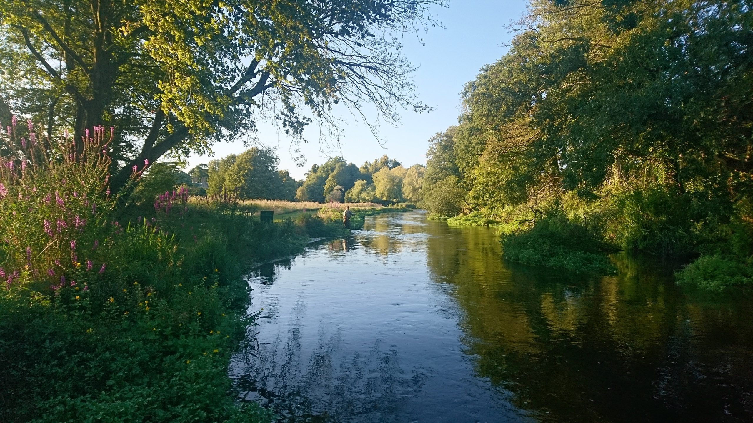April 2019 – Downstream view of Home beat pool showing the new bank configuration following the double weir removal. Whilst several hundred tonnes of toxic sediment were/was? removed, the over-deep bed was then re-claimed with a similar volume of gravel such that the attractive, albeit shallower, pool feature has been maintained. The embankments were designed to ensure an equitable flow split between the main river whilst providing an ideal open amenity area for guest anglers and an ideal spot for fly fishing tuition.