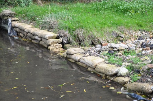 Originally constructed from dressed stone as part of an historic milling system, the leaking concrete bag repairs were undermining surrounding bank margins and causing an obstruction to fish passage. There was also the on-going potential for drainage of and environmental damage to the main mill leat channel in the event of a flood blow-out. The original repair had also been back-filled with builder’s rubble which was proving both unsightly and unstable so a major site clearance and tidy-up was also part of the brief.