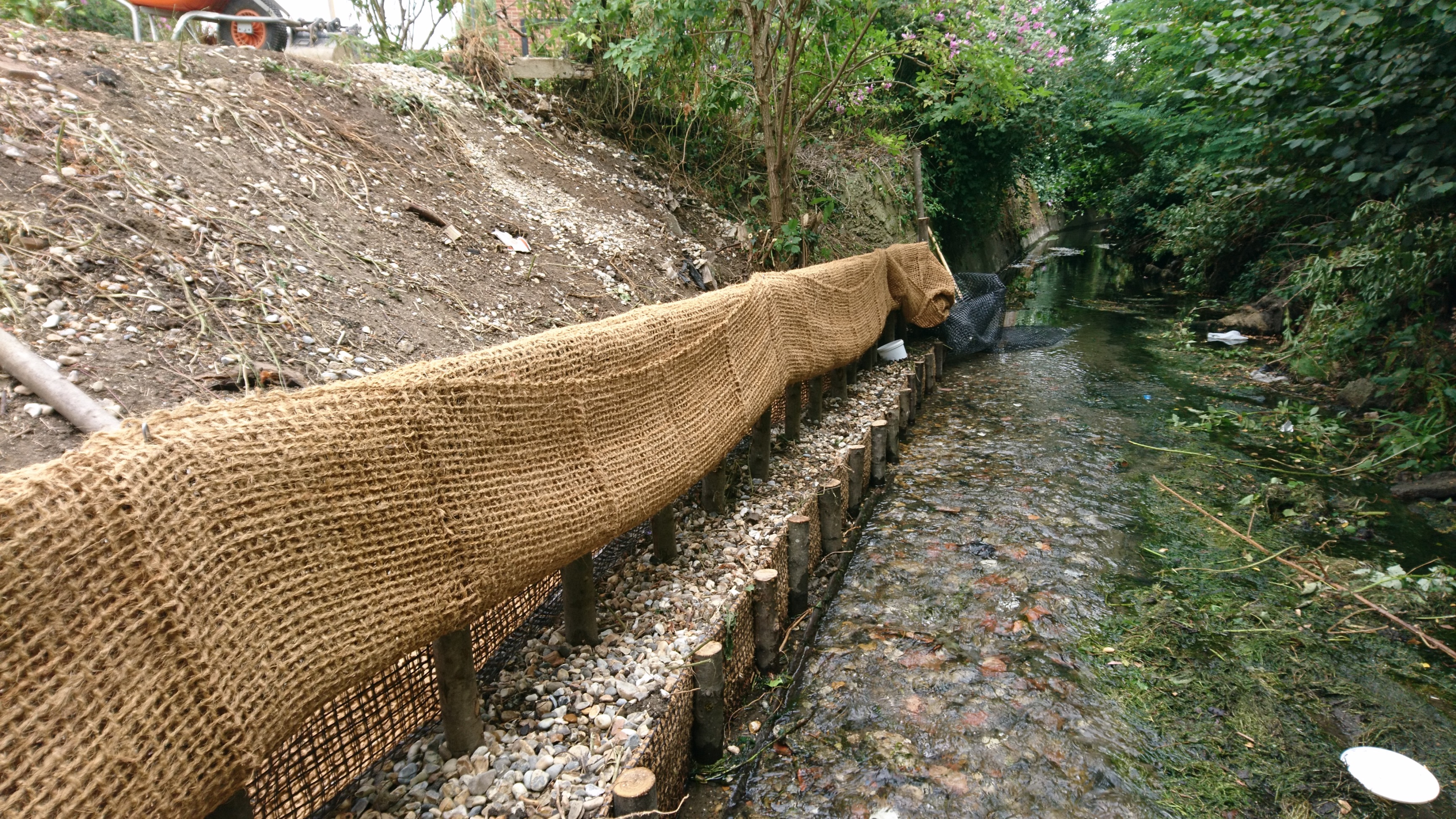 A double tier “coirnet” revetment was designed and built by Cain Bio-engineering as a solution to the problem, considerably increasing the area of the garden and providing long term protection for the stream bank against erosion.