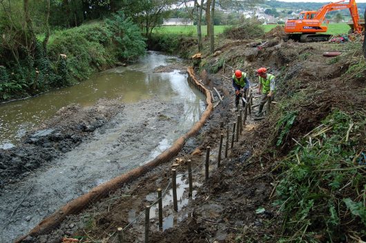 The completed structure was then top-dressed with a sacrificial layer of gravelly growing medium containing native root stock and seed bank, before site-won Willow stakes were cut from bankside saplings and driven into the new sloping bank. These provided the structure for the bio-element of the engineering.