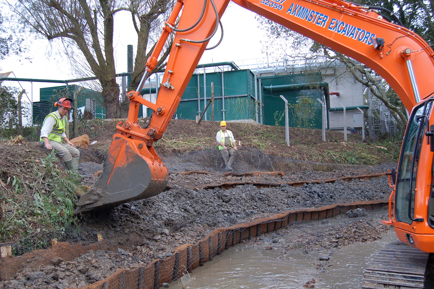 Wessex Water Plc operates a local sewage treatment works, the settlement tank of which is perched close to the edge of a highly-erosive outside bend of the river, shortly before it enters sea.