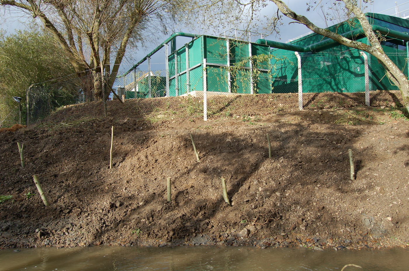 The completed structure was then top-dressed with a sacrificial layer of gravelly growing medium containing native root stock and seed bank, before site-won Willow stakes were cut from bankside saplings and driven into the new sloping bank. These provided the structure for the bio-element of the engineering.