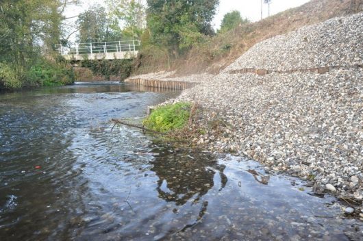 The structure consisted of a 3-tier protective revetment installed along the 45m of left bank downstream of the farm access bridge. This bio-engineered structure is constructed from geotextile, which was retained with sweet chestnut stakes installed from a floating works platform. Gravel was then placed behind the geotextiles, using an innovative, low impact pumping system, and finally the back-fill area was planted with live willow stakes.