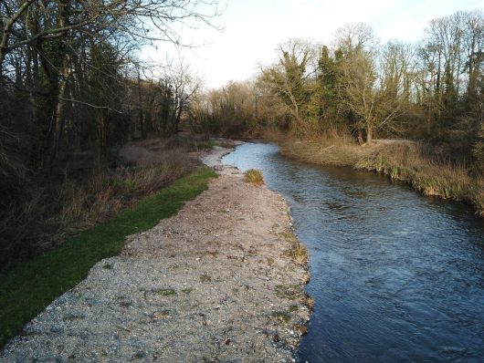 ‘X’ marks the spot where on 02/01/18 just three weeks after project completion a hen salmon was observed cutting a large redd on the recently-placed gravels. The up-welling of the 2m wide redd can be clearly seen.