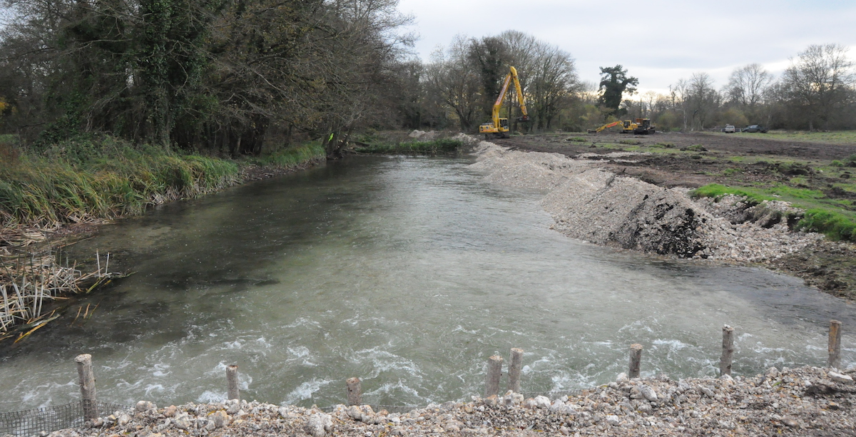 One of the oft-cited concerns levelled at river restoration practitioners is that of over narrowing, exacerbated by the fact that anglers and riparian owners have become habituated to unnaturally wide and over-deep river channels artificially backed-up by weirs. During the early stages of restoration planning, William Buckley, Bossington estates’ Trustee and fishery manager, walked the reach with Simon Cain to discuss the proposed works and was very specific about the result he was looking for:
